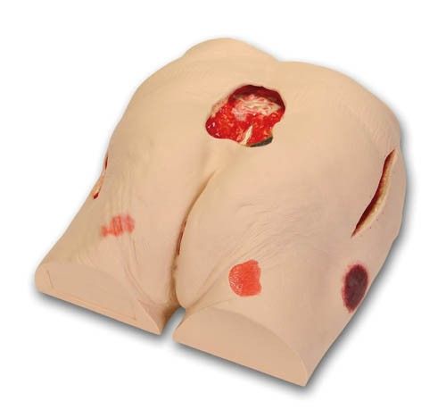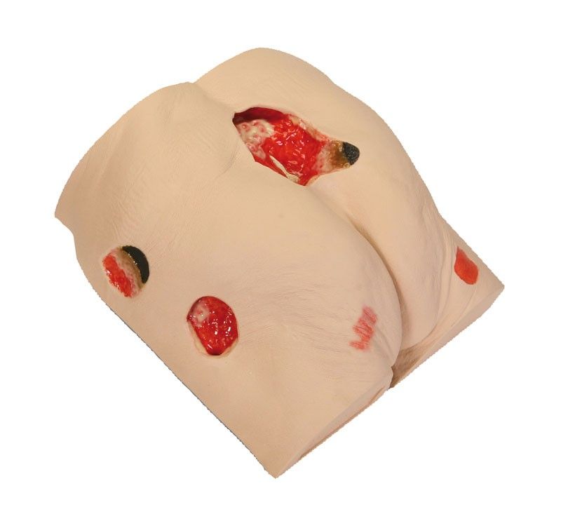 El modelo de este aparato es un modelo de adulto que ha sido moldeado a partir de una persona de 74 años quien presenta múltiples ulceras de diferentes tipos y en diferentes estados de progreso: Estado I, Estado II, Estado III y Estado IV. Debido a esto, le será posible variar los escenarios de sus prácticas médicas y variar la complejidad de estos para que usted se prepare para poder actuar adecuadamente en diferentes contextos.