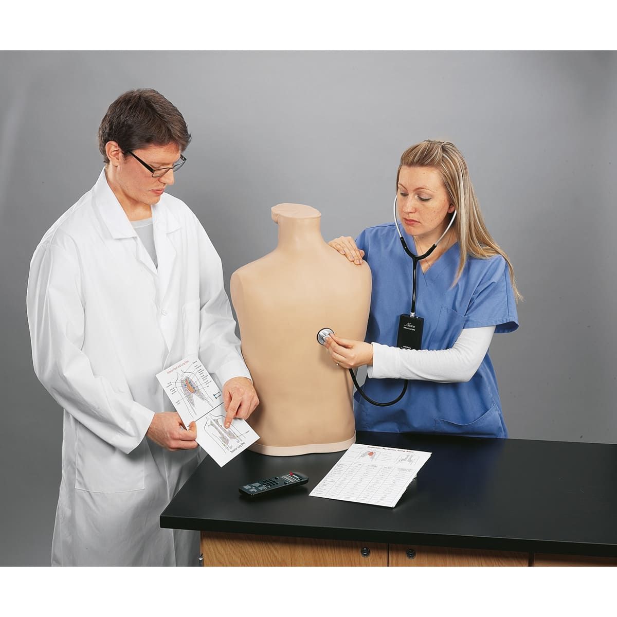 El docente puede seleccionar diversos estados mediante un telemando inalámbrico. Después de que el estudiante haya palpado y encontrado el punto de auscultación correcto, se pueden auscultar los soplos cardíacos y murmullos pulmonares mediante un estetoscopio especial (SmartScope). Tras realizar esto, el estudiante podrárealizar el diagnostico comparando y analizando los diferentes sitios que fueron auscultados. El profesor podrá seleccionar previamente la patología (del amplio catalogo disponible) con el fin de que el estudiante pueda diagnosticar la patología correcta.