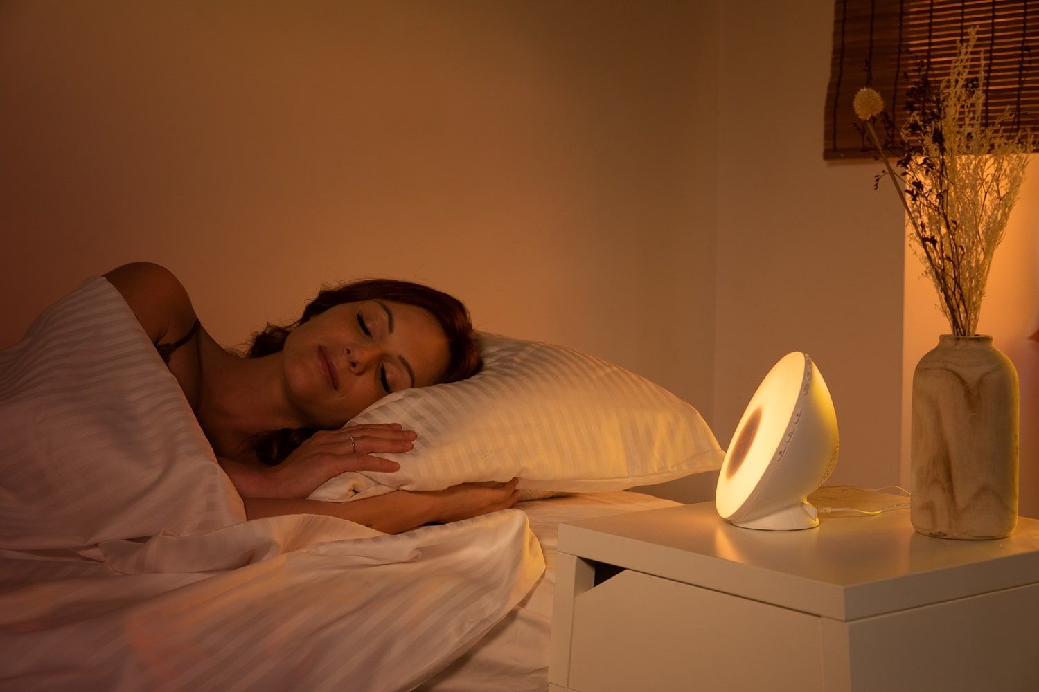 Este dispositivo inteligente presenta una intensidad luminosa regulable, que aumenta hasta una cálida luz amarilla durante 30 minutos por la mañana y disminuye por la noche durante tres periodos posibles (15, 30 o 60 minutos). También cuenta con una selección de 6 sonidos relajantes y la radio, para crear un ambiente relajante o enmascarar el ruido ambiental.