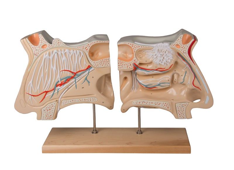 Este aparato dispone de una nariz dividida en dos partes, desde la base del cerebro hasta al comienzo de la cavidad bucal. Esta división muestra dos representaciones distintas: en el lado derecho es posible observar el tabique de la nariz, las venas y los nervios. En el lado izquierdo, usted podrá observar la estructura interna completa de la cavidad nasal, así como el seno y la trompa de Eustaquio.