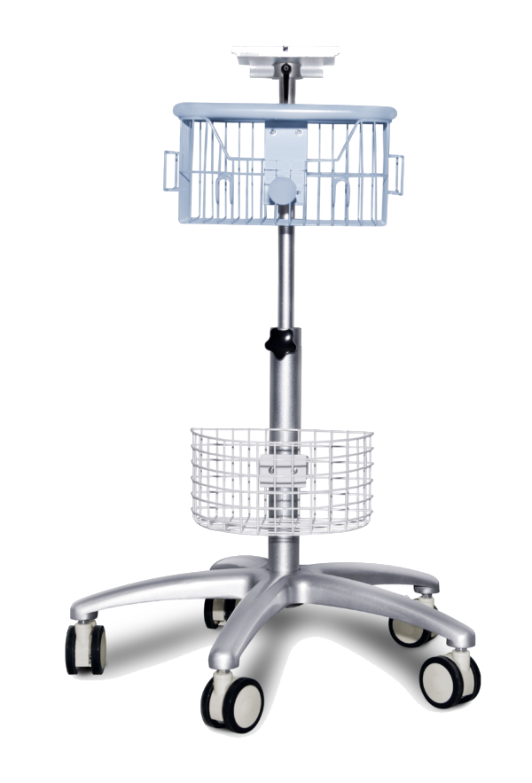 Práctico y funcional, este soporte con ruedas incorpora dos cestas de almacenamiento para facilitar la organización de accesorios como cables, electrodos y otros consumibles, contribuyendo a un espacio de trabajo más ordenado. Su altura regulable mediante una rueda selectora integrada permite adaptar la bandeja a la posición ideal para cada uso, proporcionando una comodidad óptima al usuario.