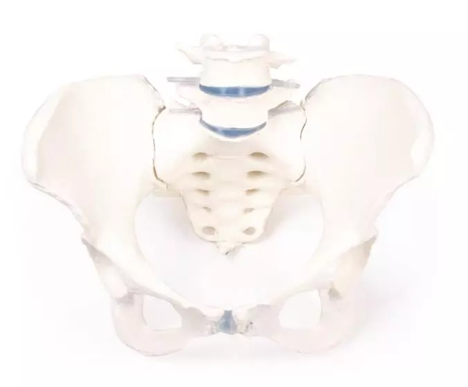 La estructura de la cadera femenina adulta se compone del hueso de la cadera, del sacro con el coxis y de 2 vertebras lombares, con montaje articulado de la symphyse.