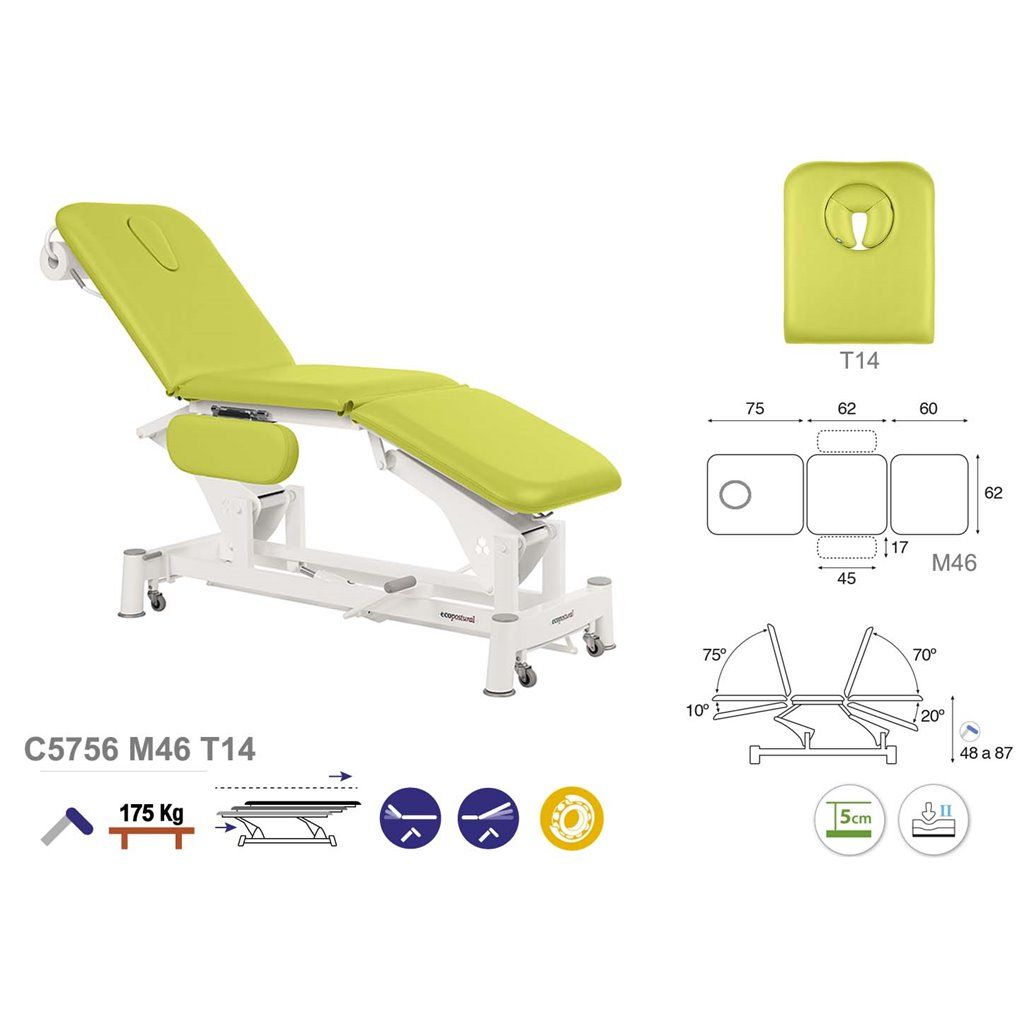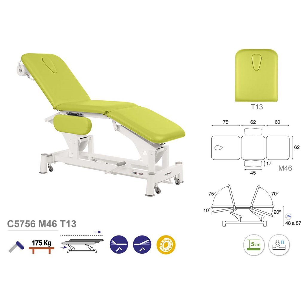 Ecopostural C5756 Mesa electrohidráulica de 3 secciones - Regulación de altura: 48-87 cm - Dimensiones estándar: 62 x 198 cm (M48) - Reposacabezas estándar T13: respaldo con cavidad facial en forma de lágrima y tope - Sistema de regulación de altura mediante pedal hidráulico - Capacidad de carga máxima: 175 Kg - PRODUCTO CE - Garantía: 3 años