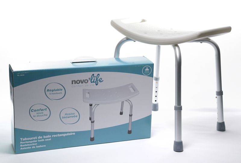 El taburete de baño Novo'Life es un sólido soporte que se puede utilizar tanto en una bañera como en una ducha, gracias a su estructura en aluminio cepillado. Su asiento curvo asegura una gran comodidad y sujeción a sus usuarios, además cuenta con dos robustas asas a los lados para facilitar la autonomía del usuario. Fácil de ajustar, el asiento de baño cuenta con 5 alturas regulables según las necesidades de cada usuario.