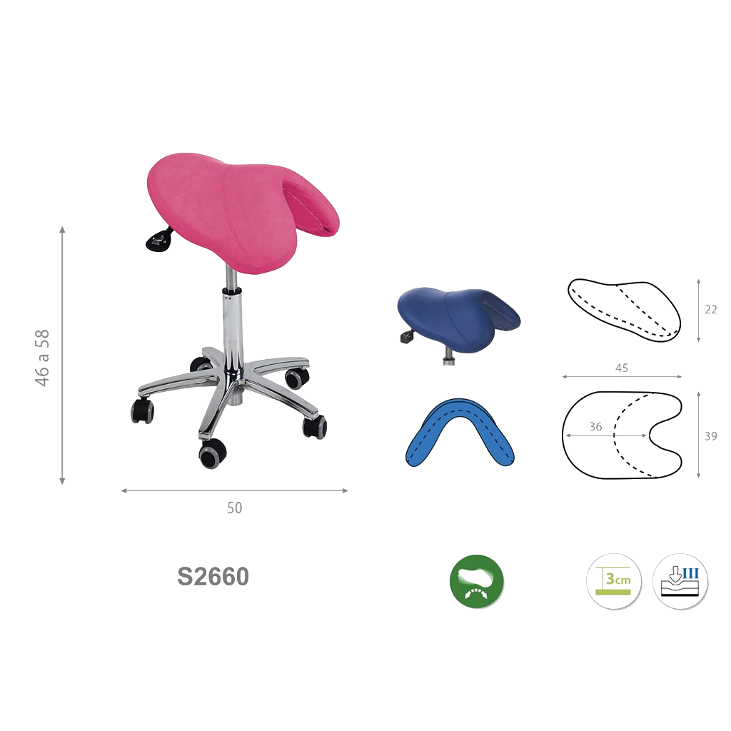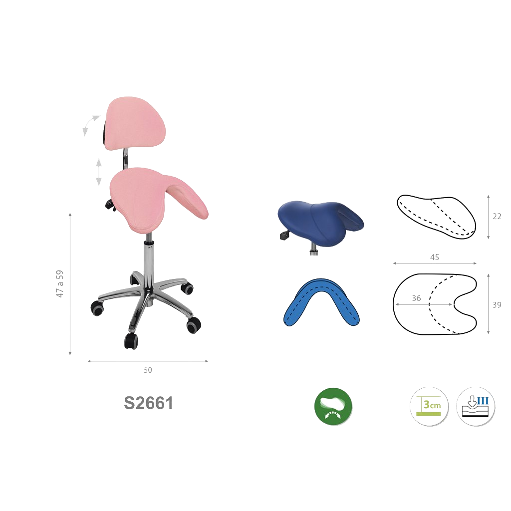Diseñado para durar, su base de aluminio de 50 cm garantiza estabilidad y solidez, mientras que el asiento de 45 cm, con su firme espuma de 3 cm (soporte III), proporciona un confort constante incluso durante un uso prolongado. El modelo S2661 añade un respaldo ergonómico para un apoyo adicional de la espalda.