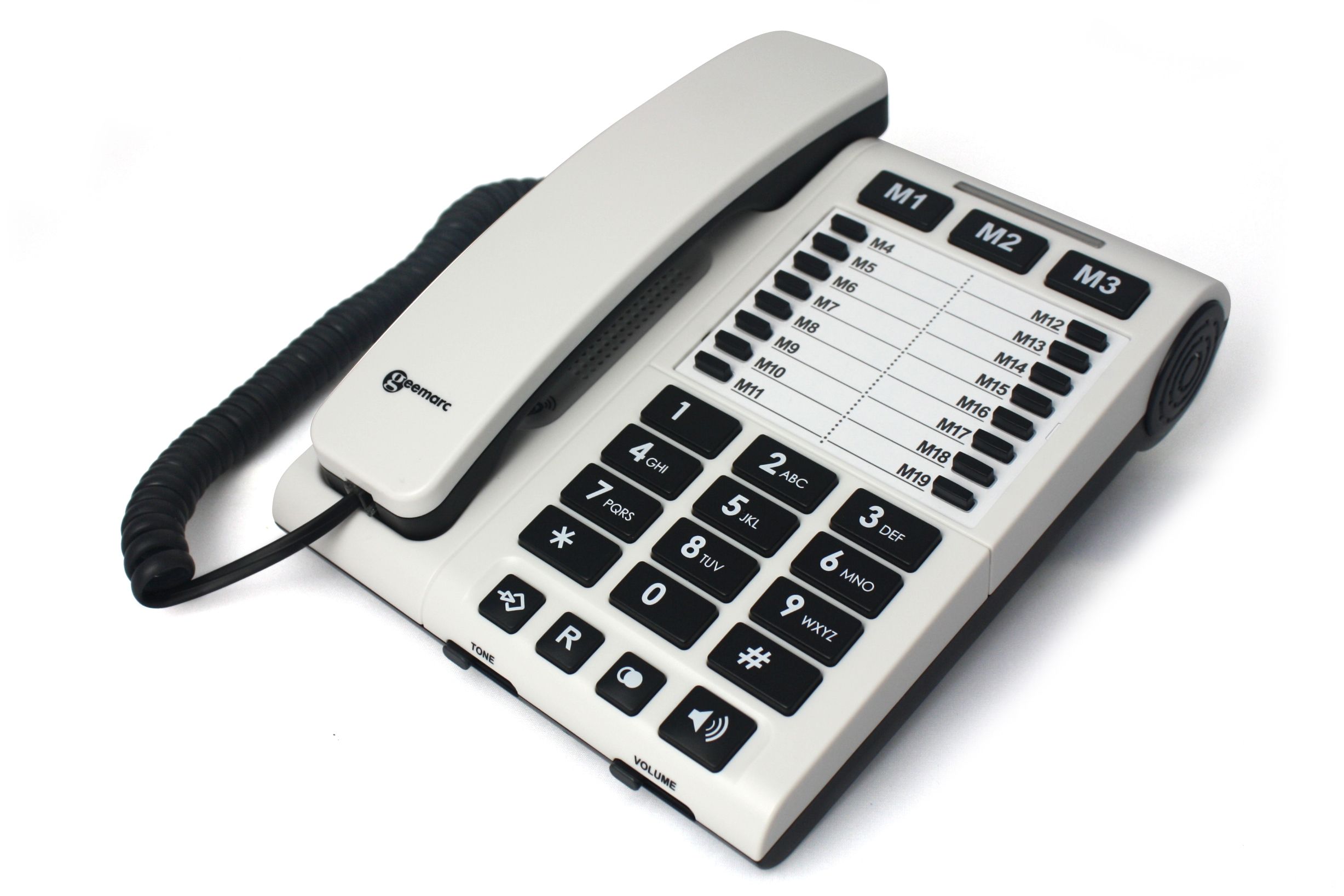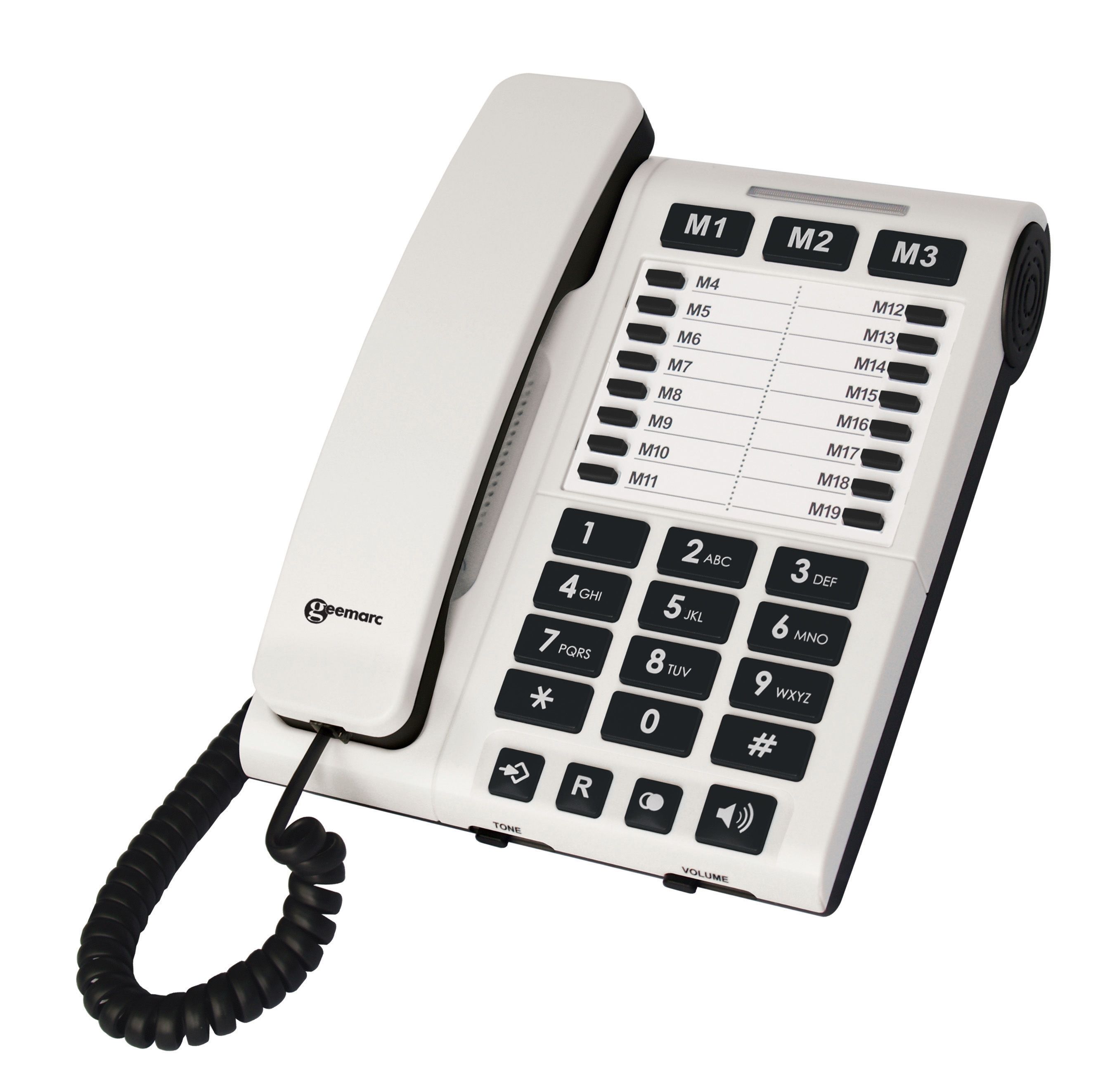 El Teléfono fijo multifuncional CL1200 Geemarc es un teléfono con teclas grandes para que sean fácilmente reconocibles por el usuario. Para simplificar su uso es posible guardar los números preferidos y acceder a ellos con sólo pulsar una tecla.