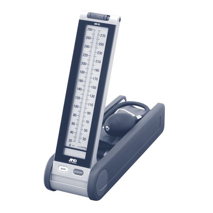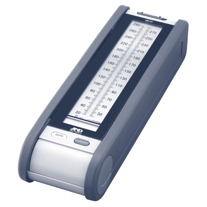 Tensiómetro de columna AND UM 101 sin mercurio - Botón marcador del nivel de la presión para útiles recordatorios - Lectura digital de la frecuencia del pulso - Dimensiones: 96 x 322 x 66 mm - Peso: 1 kg - Garantía: 5 años.