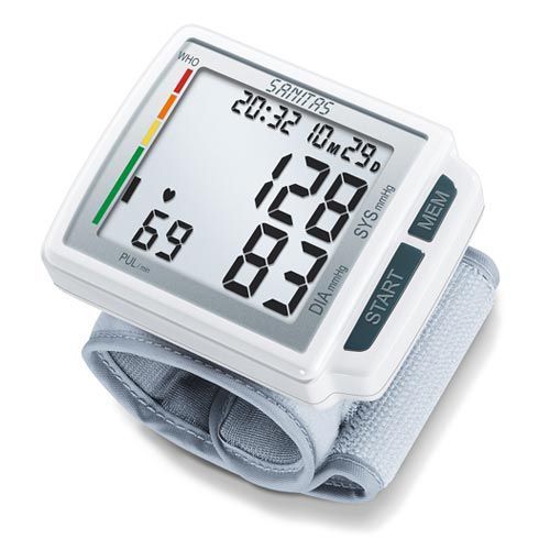 El tensiómetro digital de muñeca SBC 41 Sanitas es un dispositivo médico que garantiza una medida fiable de la tensión arterial y del pulso a nivel de la muñeca. Se trata de un modelo económico, ligero y fácil de usar. Su pantalla LCD ""jumbo"" talla XXL (275'') hace que los resultados sean muy fáciles de leer, haciendo que este modelo en particular sea perfecto para personas mayores susceptibles a problemas de visión. El modelo esta equipado de un detector de arritmias que advierte al usuario con una señal sonora si hay algún problema en el ritmo cardíaco. El tensiómetro se basa en los valores indicados por la Organización Mundial de la Salud (OMS).