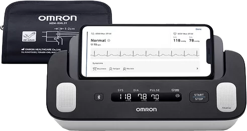 El tensiómetro Complete HEM-7530T-E3 también cuenta con una función de indicador de riesgo cardíaco que analiza los resultados de la medición de la presión arterial y del ECG para proporcionar una evaluación integral de la salud cardíaca. Puede conectarse a una computadora o smartphone para registrar y analizar los datos de medición utilizando la aplicación OMRON Connect.