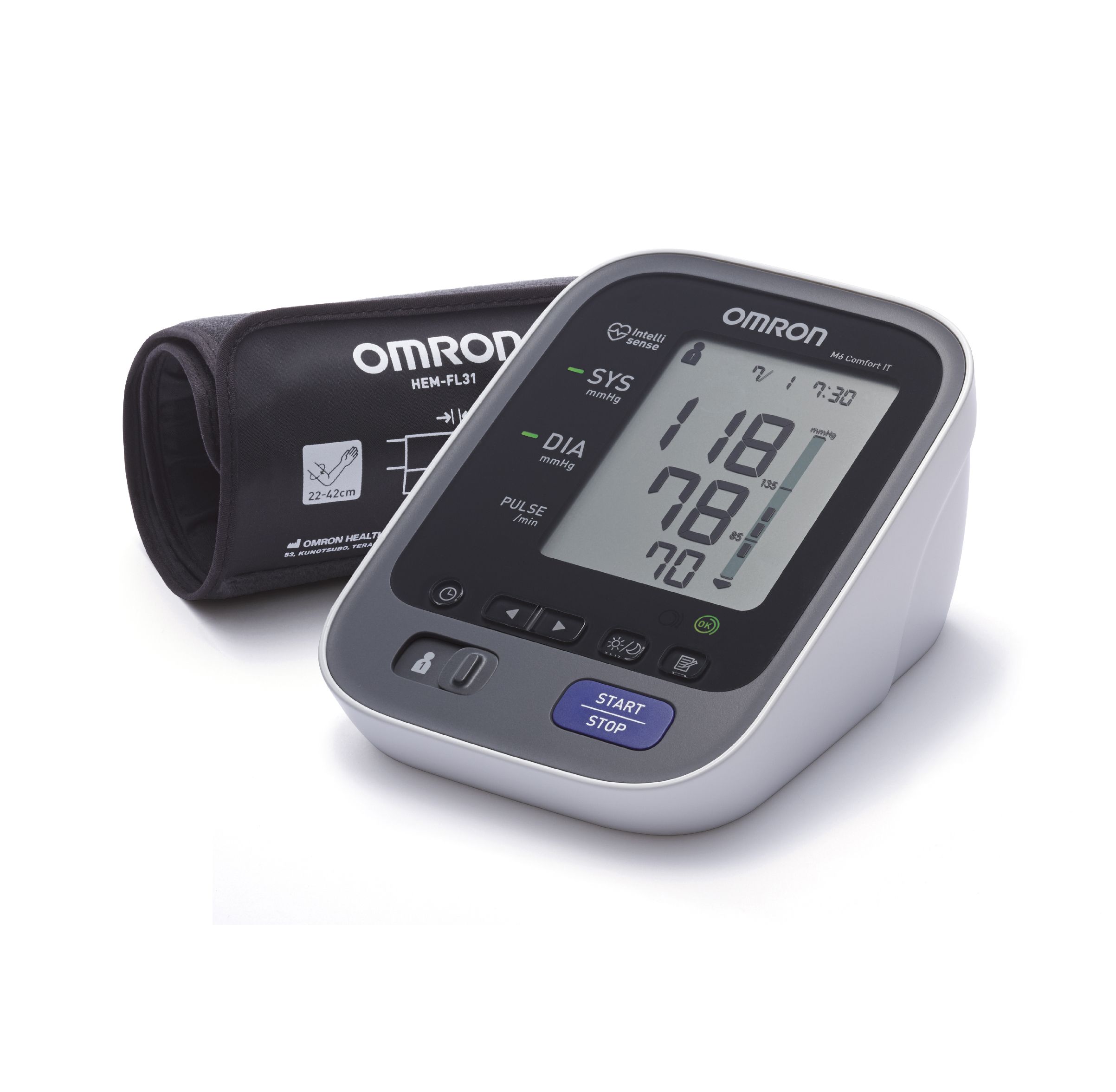El medidor de tensión Omron M6 Comfort IT HEM-7322U-E con conexión USB detecta arritmias (latidos irregulares) y dispone de un sensor de Ajuste Correcto del Manguito, de una barra indicadora del nivel de presión arterial y de un símbolo de error por movimiento.