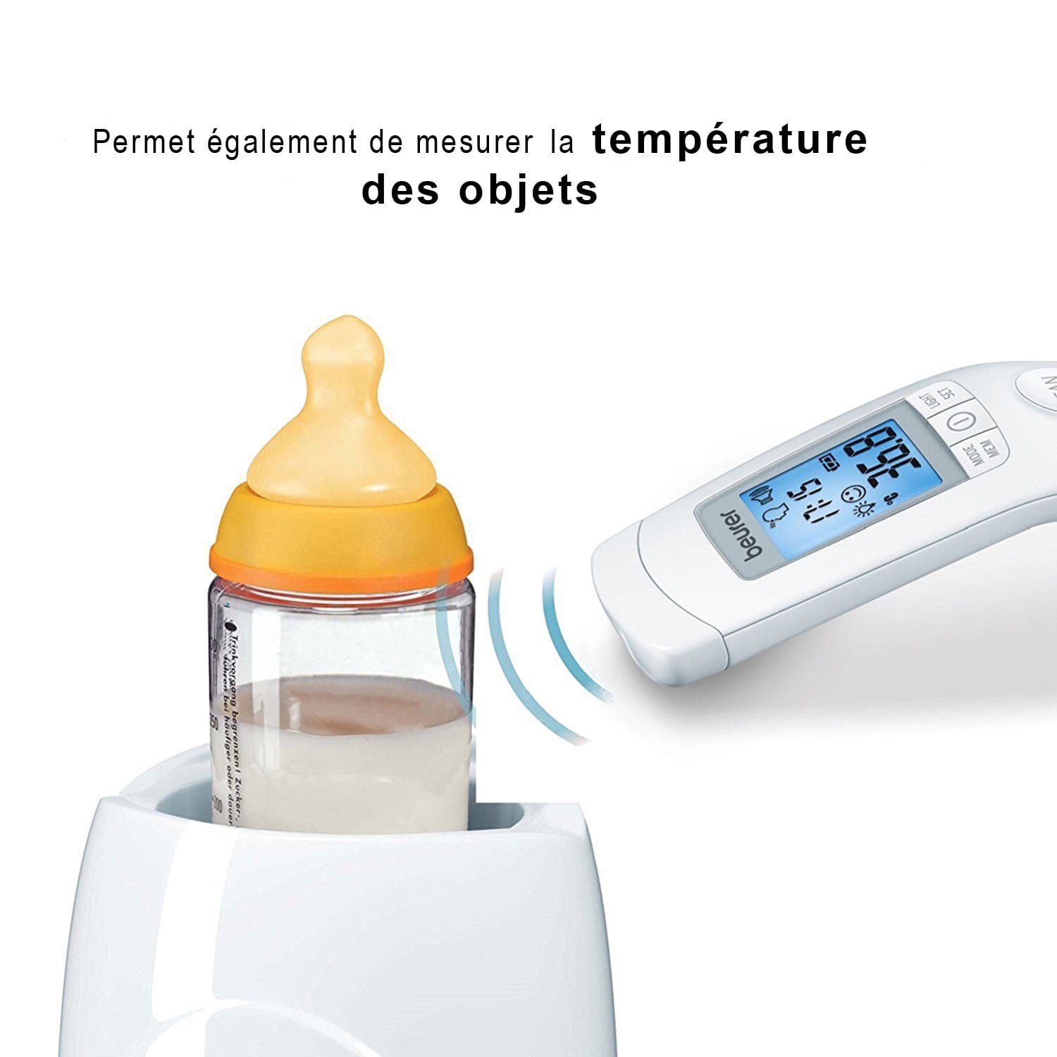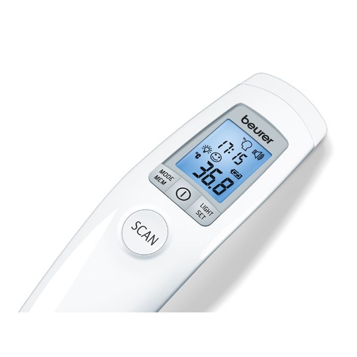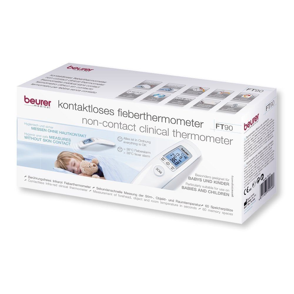 Termómetro clínico infrarrojo sin contacto Beurer FT 90 - Adaptado para tomar la temperatura de niños y bebés - 60 memorias de almacenamiento - Control de sonido (On/Off) - Indicador en °C y °F - Clinicamente Validado - Alarma de fiebre - Entregado con pilas y estuche