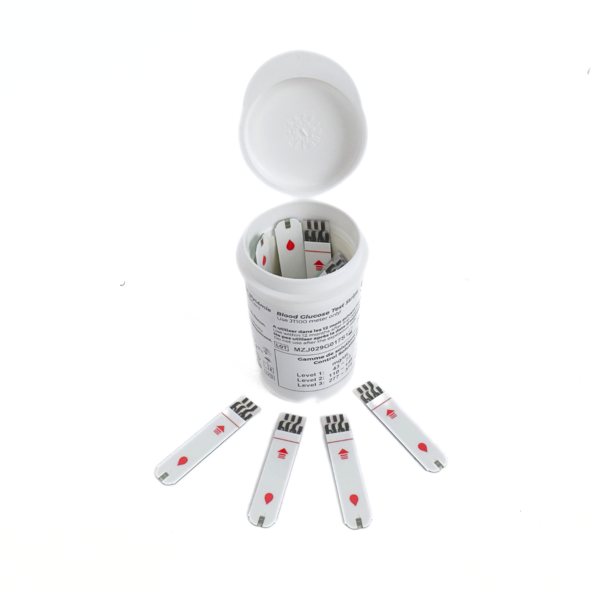 Garantice un control preciso de la glucosa en sangre con las tiras reactivas para medidor JT 100 de Spengler. Diseñadas exclusivamente para su uso con el medidor de glucosa en sangre JT 100, estas tiras son altamente fiables gracias a un sistema patentado de autocalibración que elimina las desviaciones de medición. En sólo unos segundos, obtendrá un resultado claro, utilizando una cantidad ínfima de sangre: sólo 0,5 µL.
