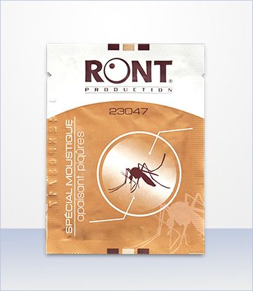 Toalla anti mosquitos Ront - Formato bolsita: 6 x 8 cm - Formato pañuelo: 130 x 170 mm - Calidad pañuelo: Semi rizado – 42g/m - Dosis: 2,5 ml - Tipo : bolsita - Referencia: 23047