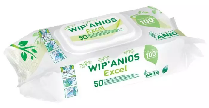 Toallitas desinfectantes Wip'Anios se impregnan con una solución, sin aldehído y libre de derivados clorados para la desinfección de superficies.