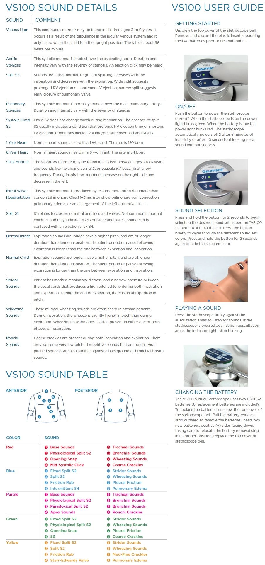 Los instructores dedican mucho tiempo de clase a enseñar en qué lugares se deben auscultar los ruidos cardíacos y pulmonares. Los estudiantes deben aprender cuál es el mejor lugar para escuchar el ruido cardíaco básico, o donde colocar la campana para escuchar el estridor o sibilancias en niños de corta edad. Las características específicas de cada zona se obtienen gracias a una nueva y fascinante técnica sin cables en la cual el estudiante se sirve de los puntos de referencia anatómicos del maniquí para identificar el lugar donde escuchar cada ruido. Si lo identifica correctamente, escuchará el ruido correspondiente a través del estetoscopio y/o los altavoces externos.