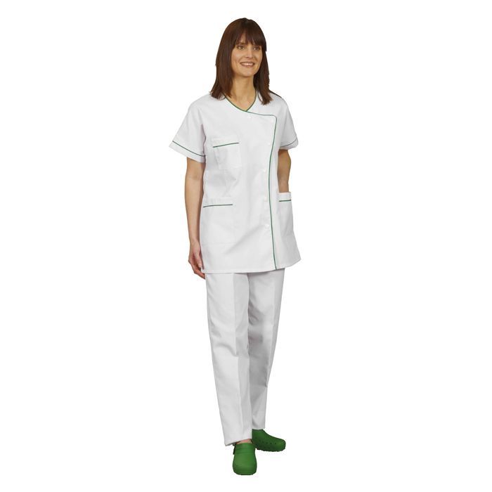 Características de la túnica médica para mujer Taffa piqué blanco con ribete verde Mulliez: