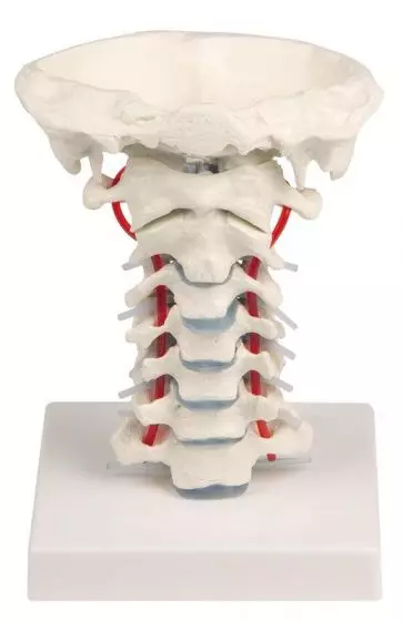 - El modelo muestra las vértebras cervicales de C7 a C1 y una parte de la base del cráneo.