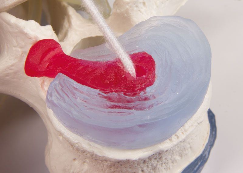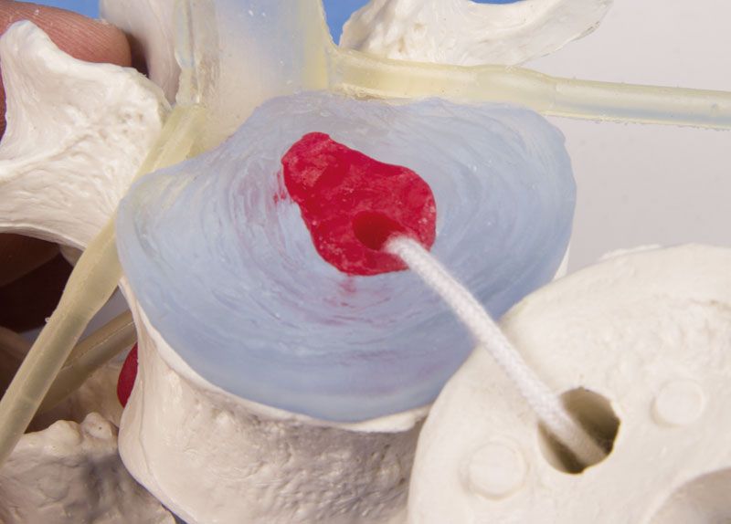Uno de los discos está en perfecto estado, por el contrario, el segundo presenta una hernia discal posterolateral derecha y, el último, una hernia discal medial. Estas tres diferentes situaciones permiten una comparación de la hernia discal y sus efectos, perfecto para los estudiantes de medicina y para los profesionales de la salud.